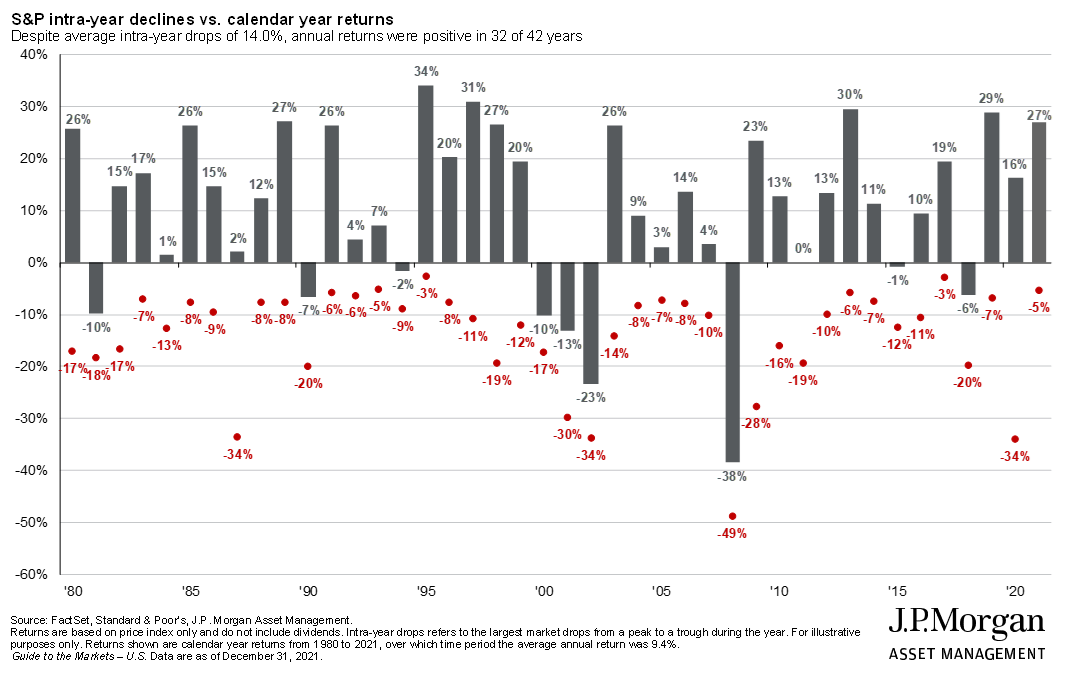 Looked at another way, thanks to our friends at JP Morgan (JPM is a holding in the Value Strategy) the SPX has dropped 14% on average at some point during every year going back to 1980. Yet, 32 out of 42 (76% of) years have finished with a positive overall return.
