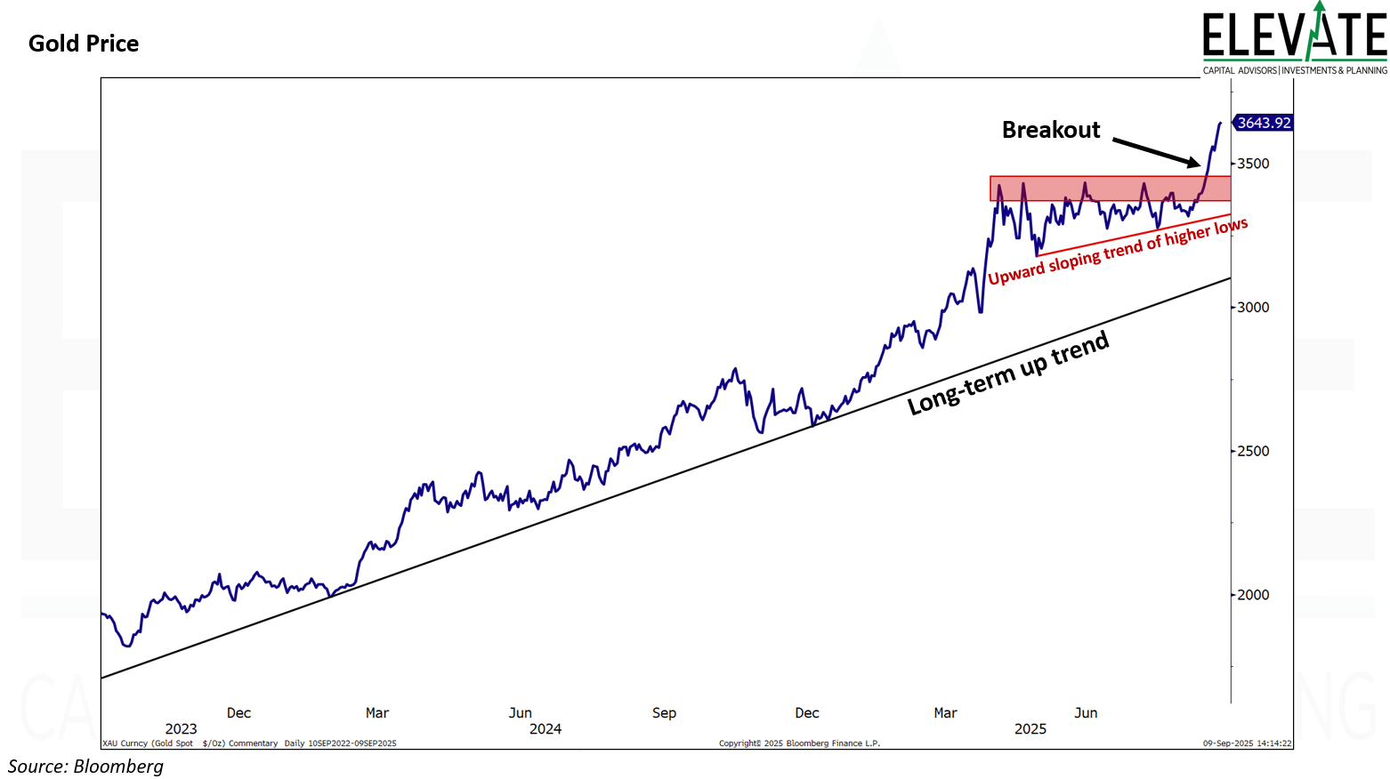 Last month, I highlighted the technical situation in gold and I pointed out that it was forming a consolidation pattern known as an ascending triangle, a bullish pattern, and would likely break out to the upside, which it did decisively. Here is an update of that chart.