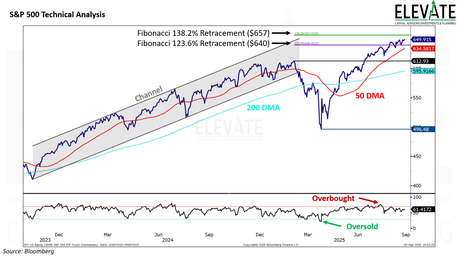 Looking at an updated technical analysis of the S&P 500 price chart, we see that the price has broken through the 123.6% Fibonacci retracement level, which I noted last month was not normally a level that I focus on, and is headed toward the more critical 138.2% level at $657. There really isn’t any resistance between here and there, and the market is neither overbought nor oversold. Both the 50-day and 200-day moving averages are rising. Absent a major catalyst, there is no reason to expect the index to do anything but continue grinding higher, despite its sky-high valuation using virtually any measure you like. The Buffett Indicator is good enough for Warren, and it is good enough for me.