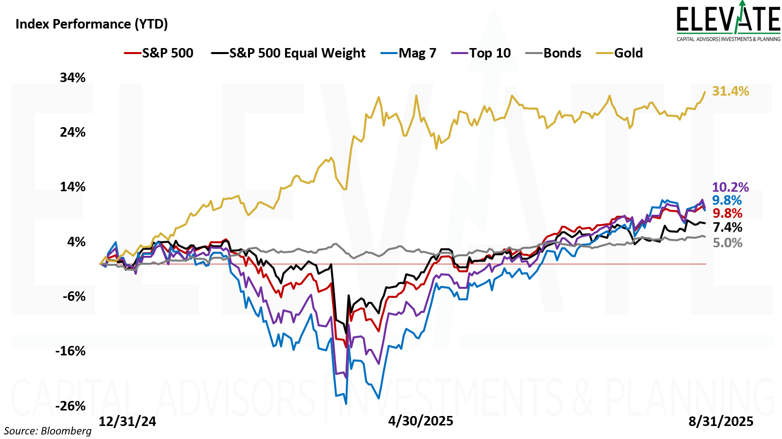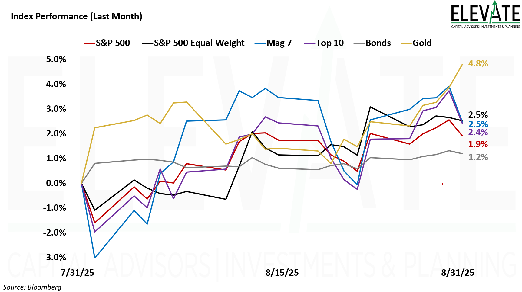 Can you believe it? Gold is on fire! It was up 4.8% last month, trouncing all the stock indexes again, and it is now up 31.4% in 2025. Guess what our biggest holding is, as a firm? That’s right. Gold!