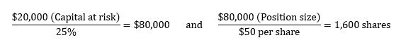 To find the maximum percentage allocation to this position, simply divide the portfolio risk (2%) by the stop percentage (25%).