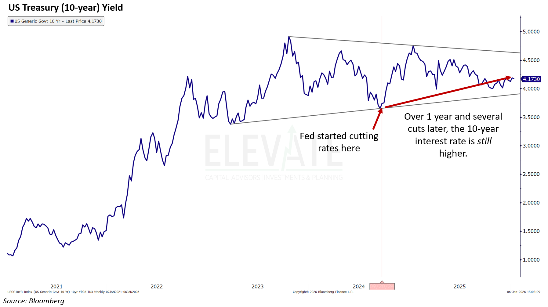 As you can see in the chart below, the 10-year yield is higher now than when the Fed began its most recent round of interest rate cuts in September 2024.