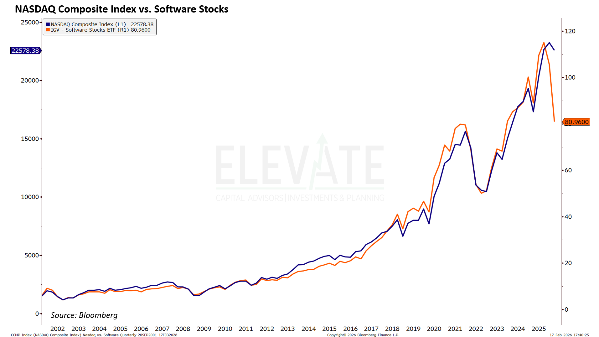 The chart above shows the NASDAQ Composite index vs. the software ETF (IGV) going back to 2001 when IGV first began trading. It doesn't take a CFA Charterholder to see that these two have moved very similarly for nearly 25 years - until recently. The recent divergence is stark. It should get any investor's attention.
