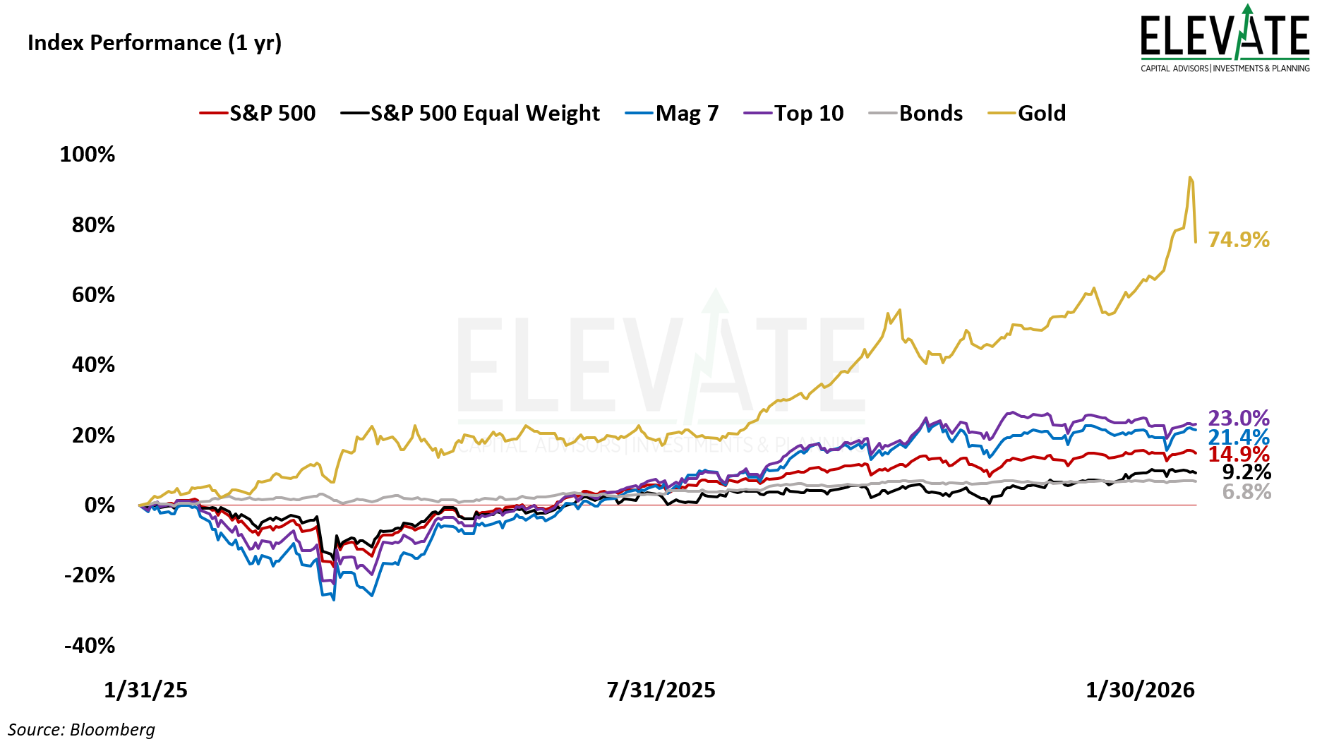 This commentary expresses the views of the author as of the date indicated and such views are subject to change without notice. Elevate Capital Advisors, LLC (“Elevate”) has no duty or obligation to update the information contained herein. This information is being made available for educational purposes only. Certain information contained herein concerning economic trends and performance is based on or derived from information provided by independent third-party sources. Elevate believes that the sources from which such information has been obtained are reliable; however, it cannot guarantee the accuracy of such information and has not independently verified the accuracy or completeness of such information or the assumptions on which such information is based. This memorandum, including the information contained herein, may not be copied, reproduced, republished, or posted in whole or in part, in any form without the prior written consent of Elevate. Further, wherever there exists the potential for profit there is also the risk of loss.