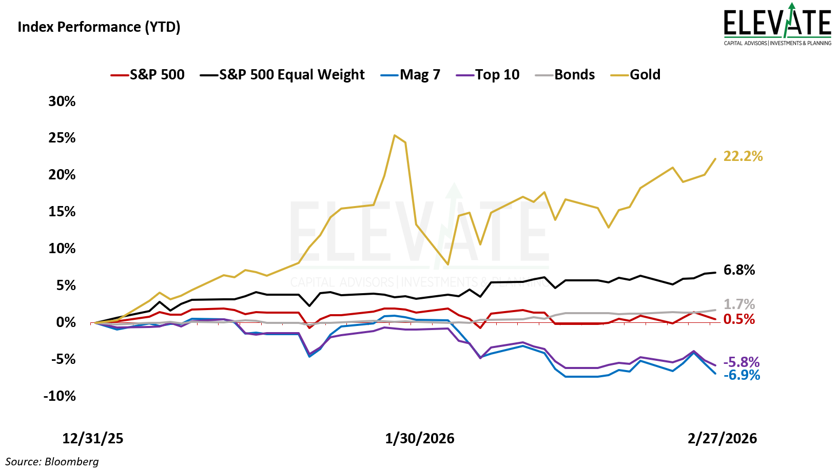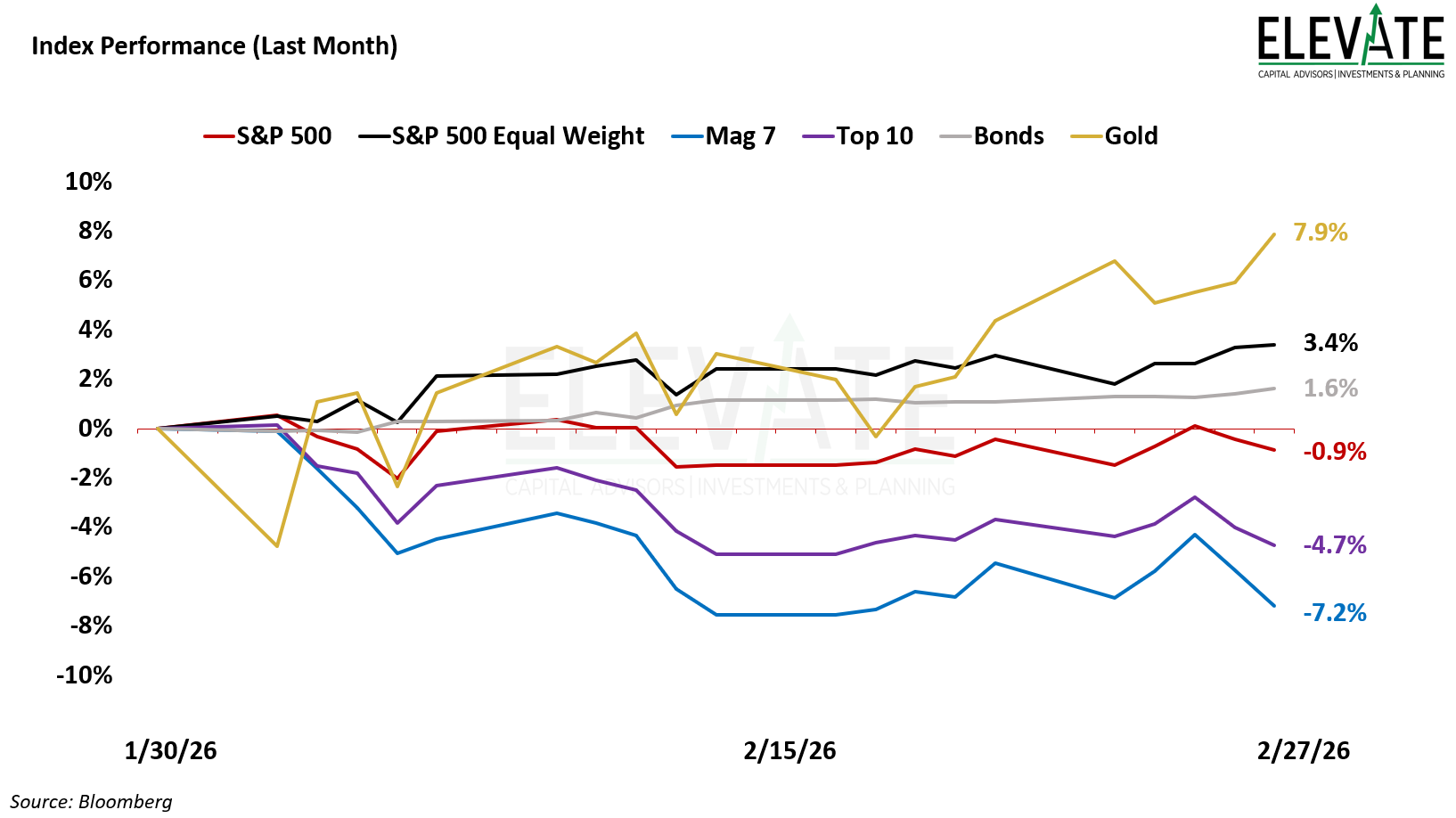 Surprise, surprise—gold was the top performer again in February, up 7.9% for the month. Meanwhile, the so-called Magnificent 7 (Mag 7) was down 7.2%, and the Top 10 was down 4.7%. With nearly 33% of the S&P 500 in the Mag 7 and nearly 39% in the Top 10, the market-cap-weighted S&P 500 index finished the month down 0.9% while the equal-weighted S&P 500 index was up 3.4%.
