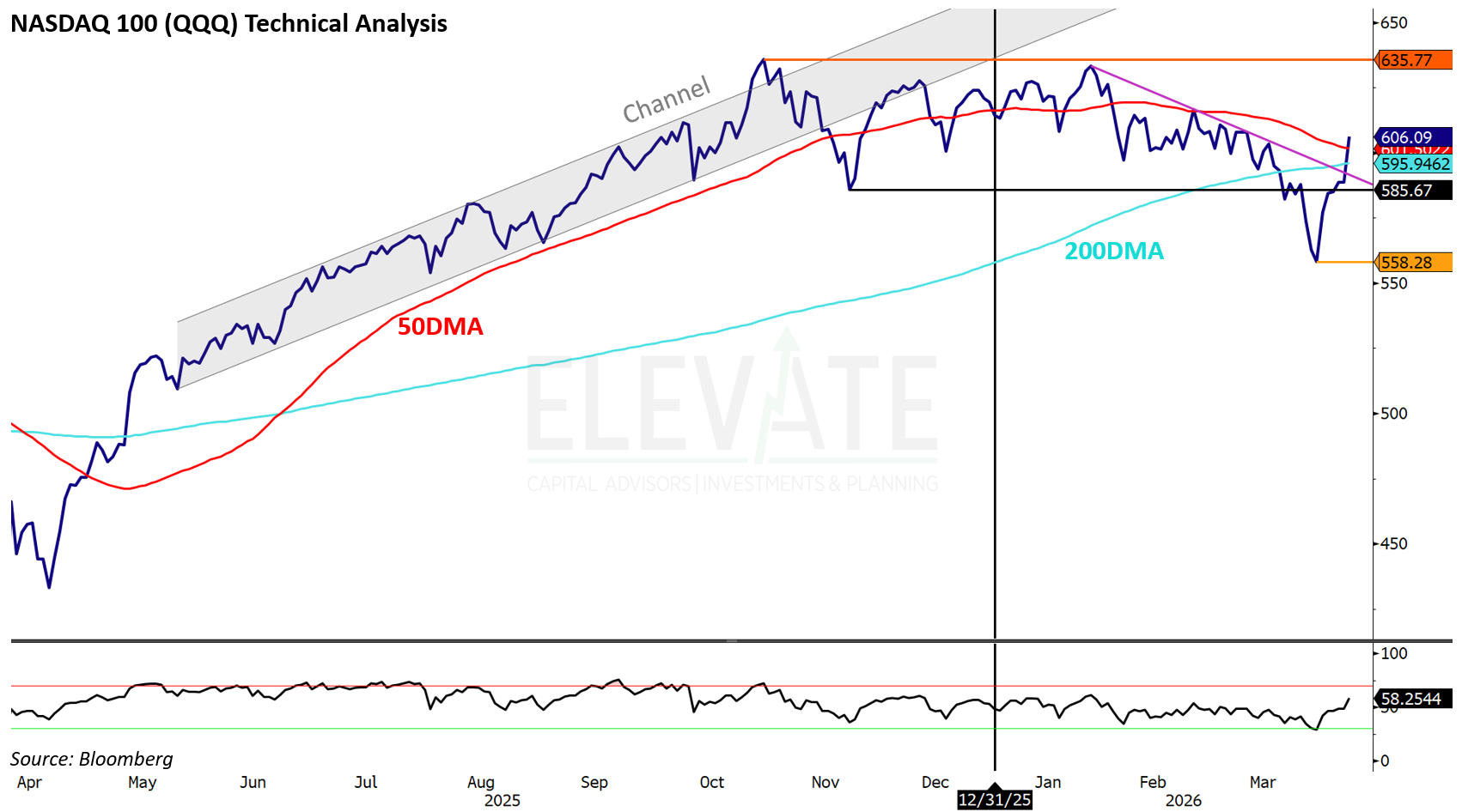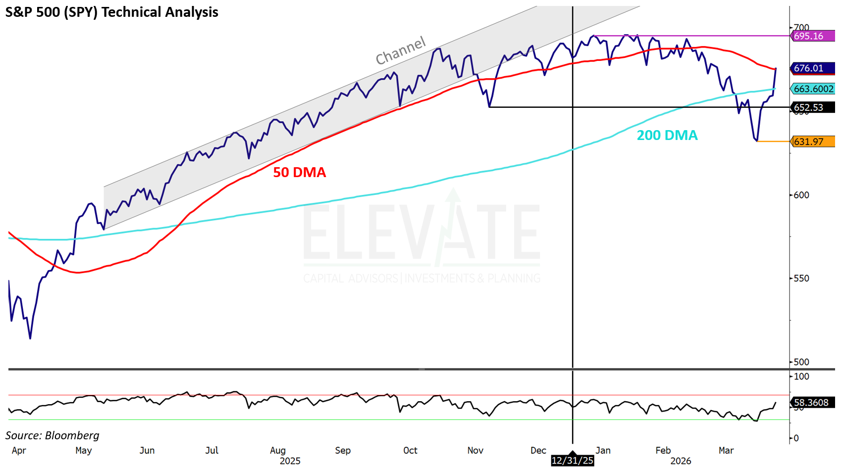 The S&P 500 (as measured by the SPY ETF) fell over 9%, but less than 10%, from its highs to a low of $631.97 on 3/30, before rallying 2.91% on the last day of the month. Had the month ended a day earlier, the index would have been down 7.87% in March. It has since rallied further on "hopes" of a ceasefire, but has run into resistance at the declining 50-day moving average (DMA) and is now trading less than 3% from its all-time high.