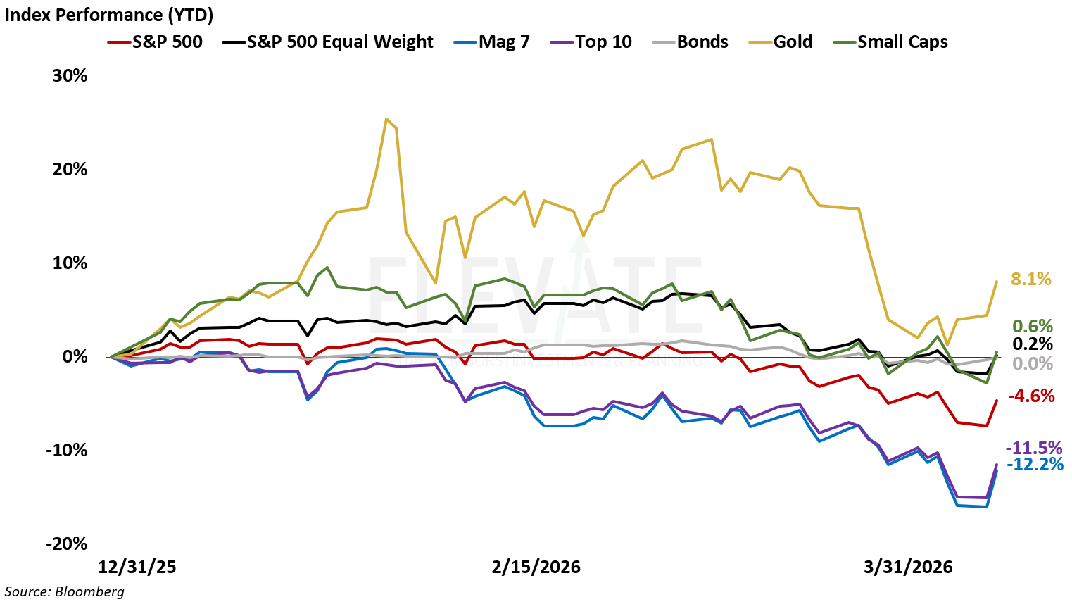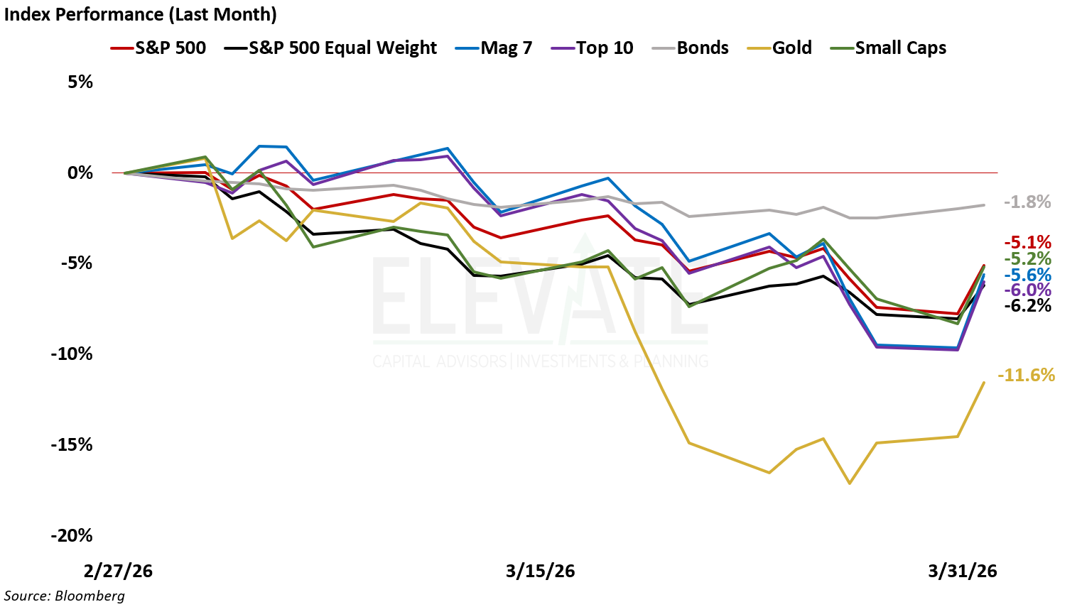 All the major indexes and prices we track were down in March, with Gold leading to the downside. We often refer to Gold as the "chaos hedge," because it normally performs well during times of, well... chaos. The current environment is nothing if not chaotic.