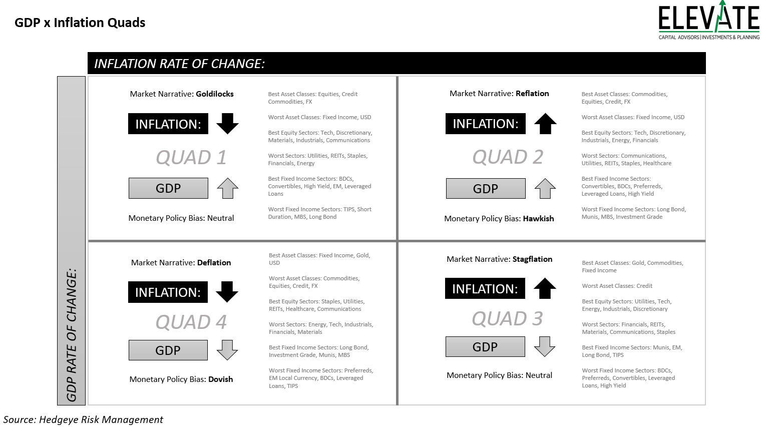 Rising prices and slowing economic growth are what we refer to as a Quad 3 environment. Our friends at Hedgeye are forecasting this environment for the next two quarters (Q2 and Q3) and potentially a Quad 4 in the fourth quarter. Of course, a lot can change between now and the end of the year, but the stagflation risks that I described last month remain front and center.