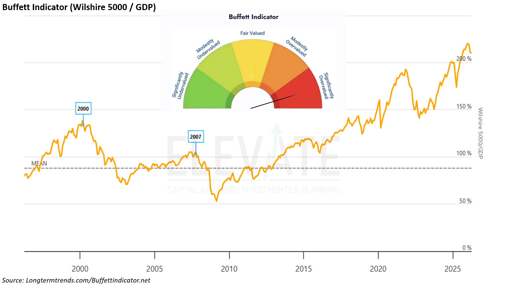 Meanwhile, stocks remain expensive, as measured by the Buffett Indicator, despite a minor pullback that barely moved the needle.