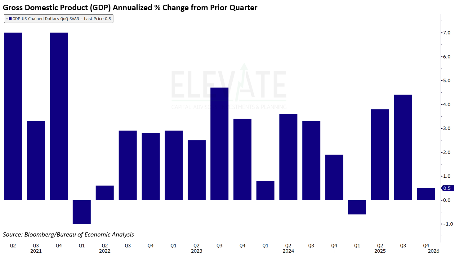 Last month, I noted that the first estimate of GDP for the 4th quarter of 2025 was disappointing at only 1.4% vs. expectations of 3%. I also pointed out that there would be one more estimate before it was finalized, as it was this morning. The second estimate cut the growth rate from 1.4% to 0.7%, and now that all is said and done, the final number is only 0.5%. Not good. So, growth materially slowed from 4.4% in the third quarter of 2025.