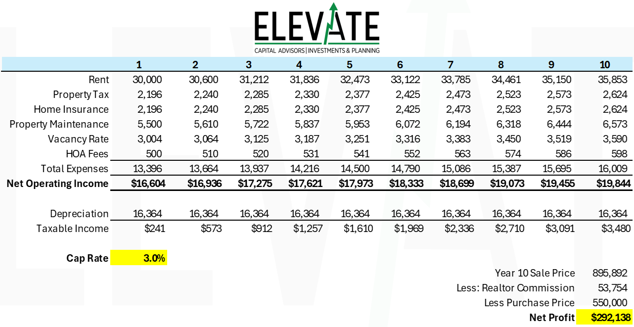 Sitting down with your excel spreadsheet, you work out the following projections over the next 10 years and account for rent and expenses increasing along with inflation.