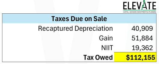 Continuing with our example, the total tax owed on the property sale is $112,115, broken out as follows.