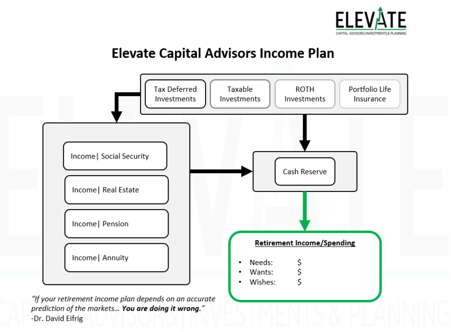 Now that you have some understanding of the pros and cons to real estate ownership, let’s discuss how it can fit into a financial plan. The Elevate Income Plan lists real estate on the income side, specifically, rental real estate. The monthly rental payments go towards supplementing retirees’ income in retirement. Of course, for real estate to fill this role, the monthly cash flow must exceed monthly expenses. This often means that properties should not be financed with a mortgage if holding them in retirement. Initially, a mortgage is fine but not once you are planning to live off the cash flow.