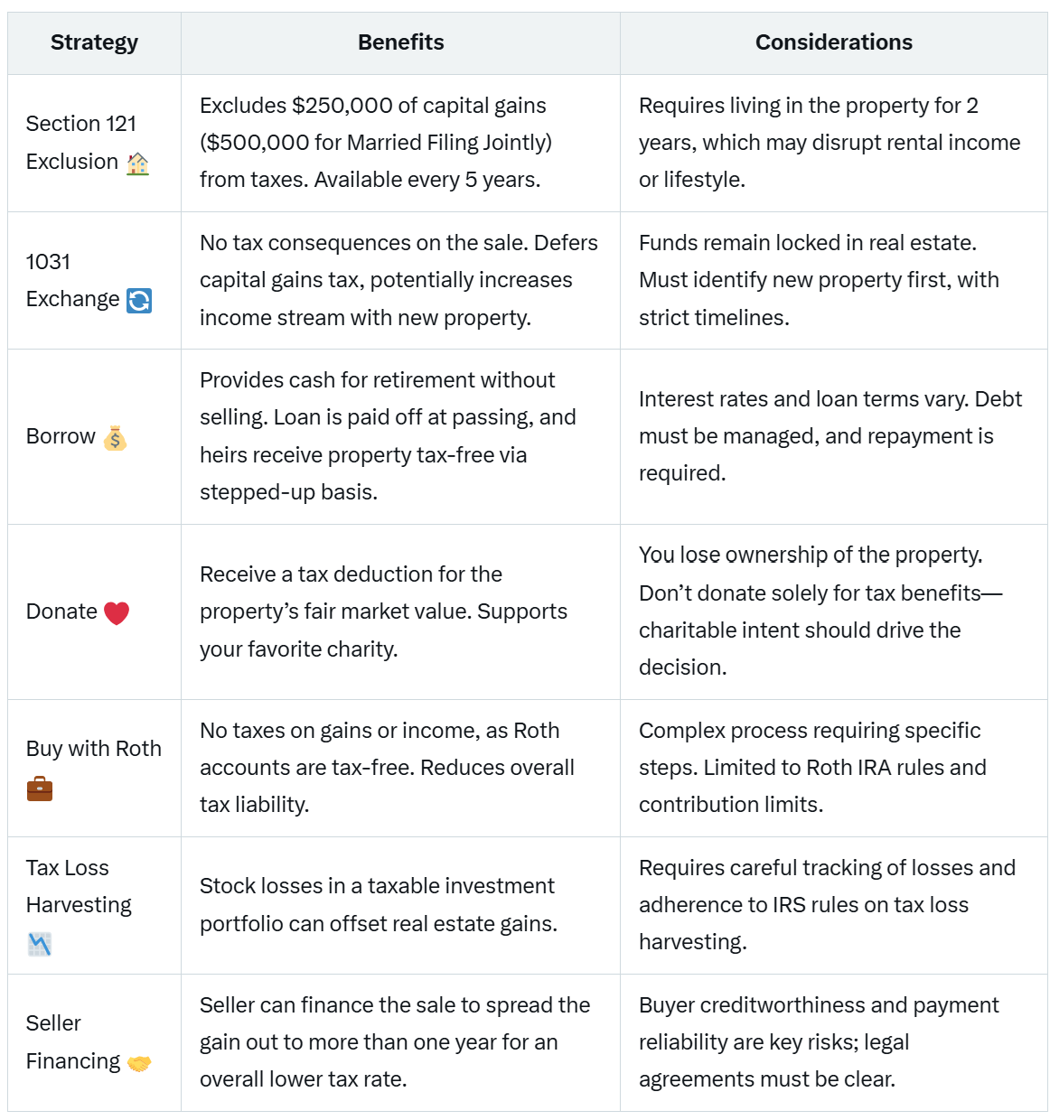 What are ways to reduce the tax bill upon sale? There are a number of ways to reduce your tax bill with a little planning and they have been summarized in the following table. The most common is the Section 121 exclusion which provides for excluding $250,000 of capital gain for a single person, or $500,000 for a married couple. This would apply if you lived in the home 2 of the last 5 years. A 1031 exchange kicks the tax bill down the road by transferring the sale proceeds of one property into another that is identified ahead of time, tax-free.